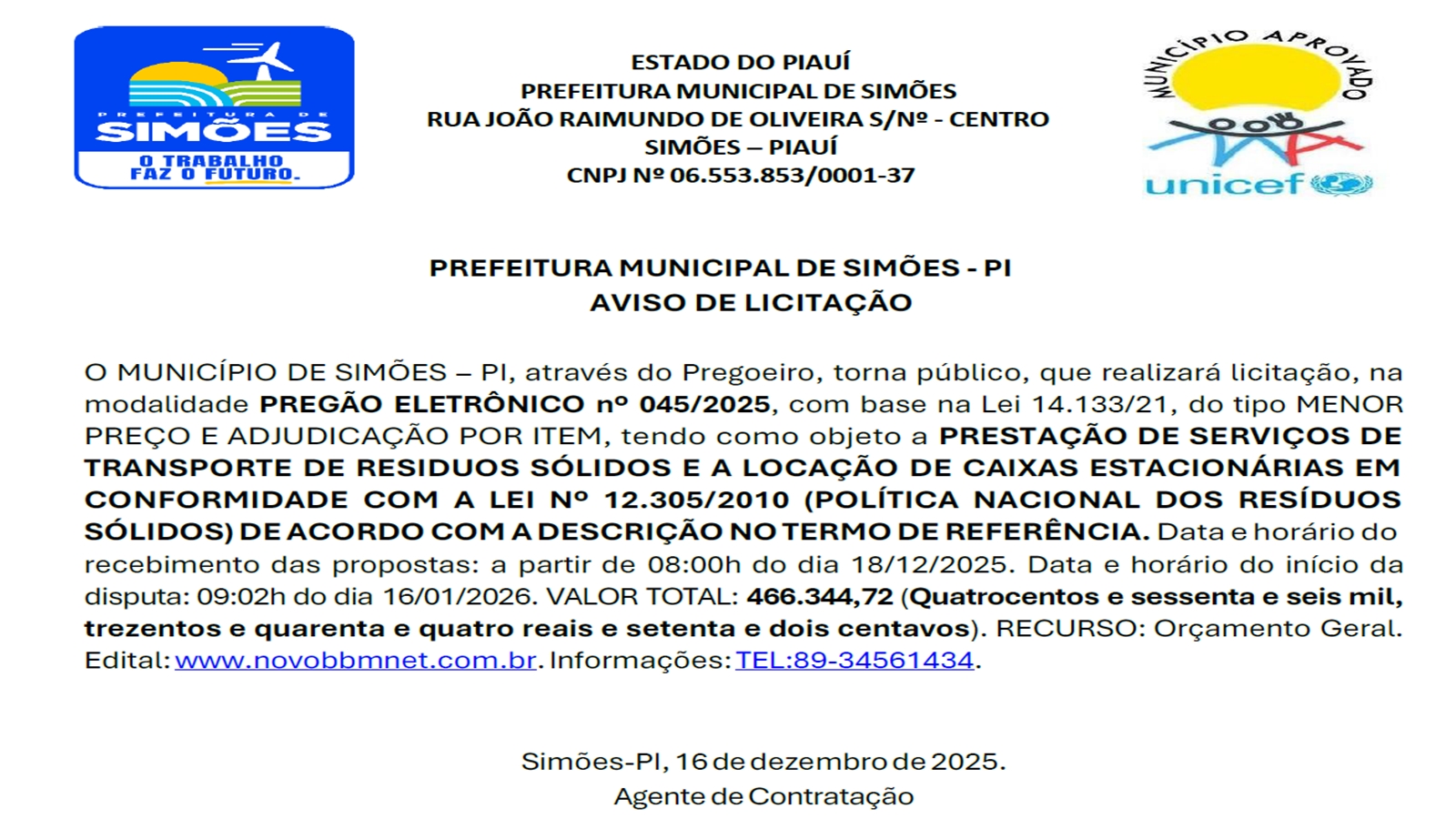 LICITAÇÃO Nº 045/2025 PARA PRESTAÇÃO DE SERVIÇOS DE TRANSPORTE DE RESIDUOS SÓLIDOS E A LOCAÇÃO DE CAIXAS ESTACIONÁRIAS EM CONFORMIDADE COM A LEI Nº 12.305/2010 (POLÍTICA NACIONAL DOS RESÍDUOS SÓLIDOS) DE ACORDO COM A DESCRIÇÃO NO TERMO DE REFERÊNCIA.