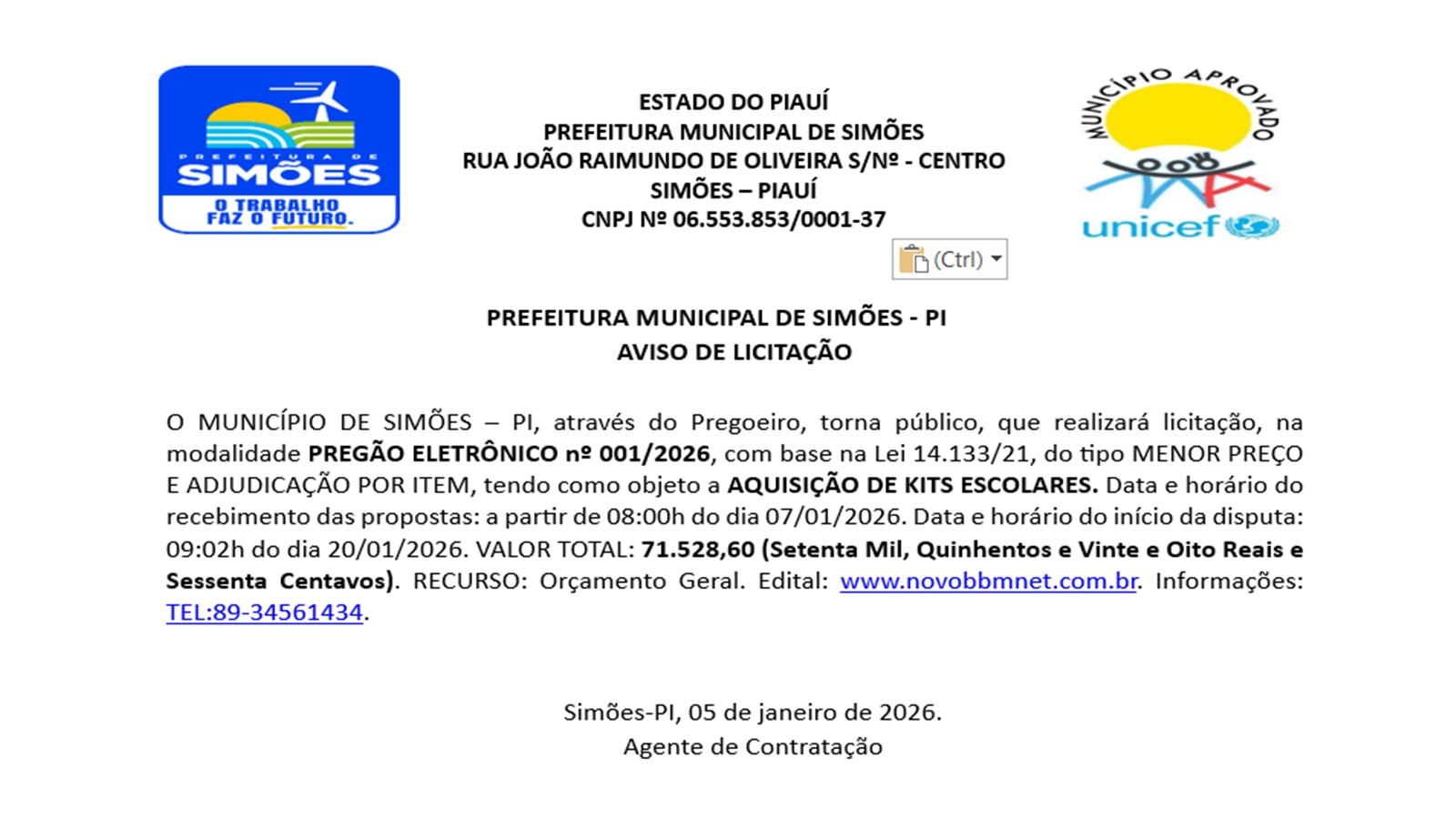 LICITAÇÃO Nº 001/2026 PARA AQUISIÇÃO DE KITS ESCOLARES