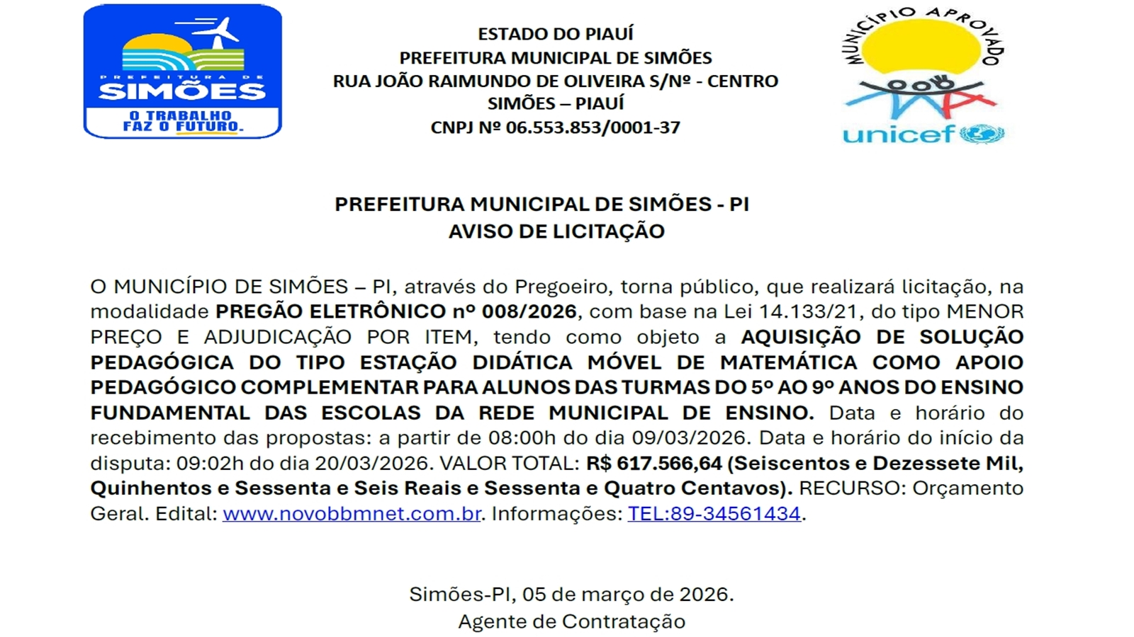 LICITAÇÃO Nº 008/2026 PARA AQUISIÇÃO DE SOLUÇÃO PEDAGÓGICA DO TIPO ESTAÇÃO DIDÁTICA MÓVEL DE MATEMÁTICA COMO APOIO PEDAGÓGICO COMPLEMENTAR PARA ALUNOS DAS TURMAS DO 5º AO 9º ANOS DO ENSINO FUNDAMENTAL DAS ESCOLAS DA REDE MUNICIPAL DE ENSINO