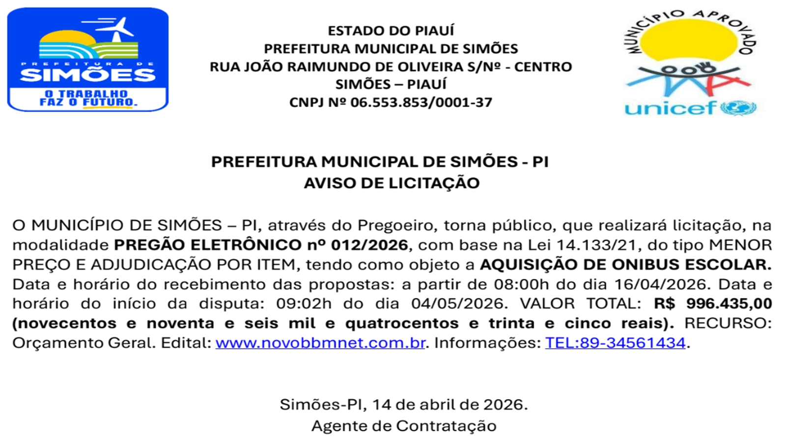 LICITAÇÃO Nº 012/2026 PARA AQUISIÇÃO DE ONIBUS ESCOLAR.